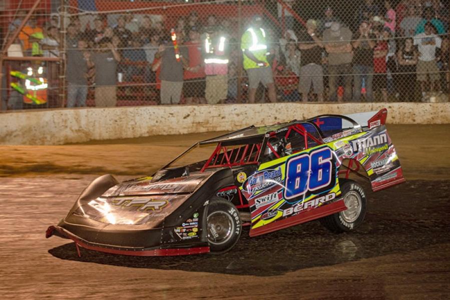Outdueling Tyler Burnett in the 20-lap Crate Late Model feature, Beard stormed to his fifth win of the season, which came ahead of Burnett, Tanner Kellick, Dalton Patrick, and Payton Brown.