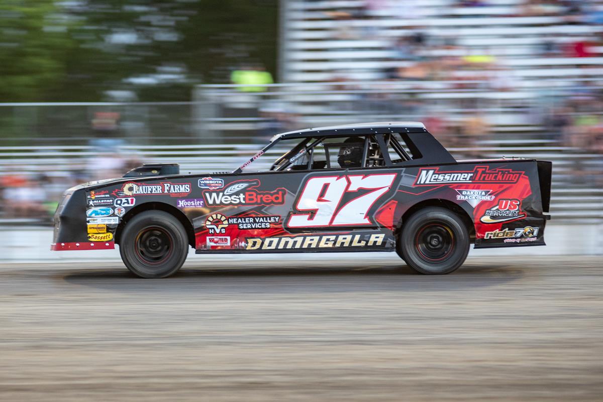 After a complete restart in the WISSOTA Street Stock feature, Kasey Ussatis took the lead when the green flag waved. Matt Dosch and Tracy Domagala raced hard for second which allowed Hunter Domagala to make it a three car battle. As they raced door to door for position, Zach Frederick now made it a four car battle. Hunter shuffled into the second position and wasted no time reeling in Ussatis. Hunter passed Ussatis on lap nine and motored away. Ussatis then fell into the clutches of Frederick. With only a few laps remaining, Frederick passed Ussatis for second, bringing Tracy with him. When the checkered flag waved, Kasey Ussatis held off Geoff Hellman for the fourth position. Tracy Domagala finished third while Zach Frederick finished a distant second place behind feature winner, Hunter Domagala.