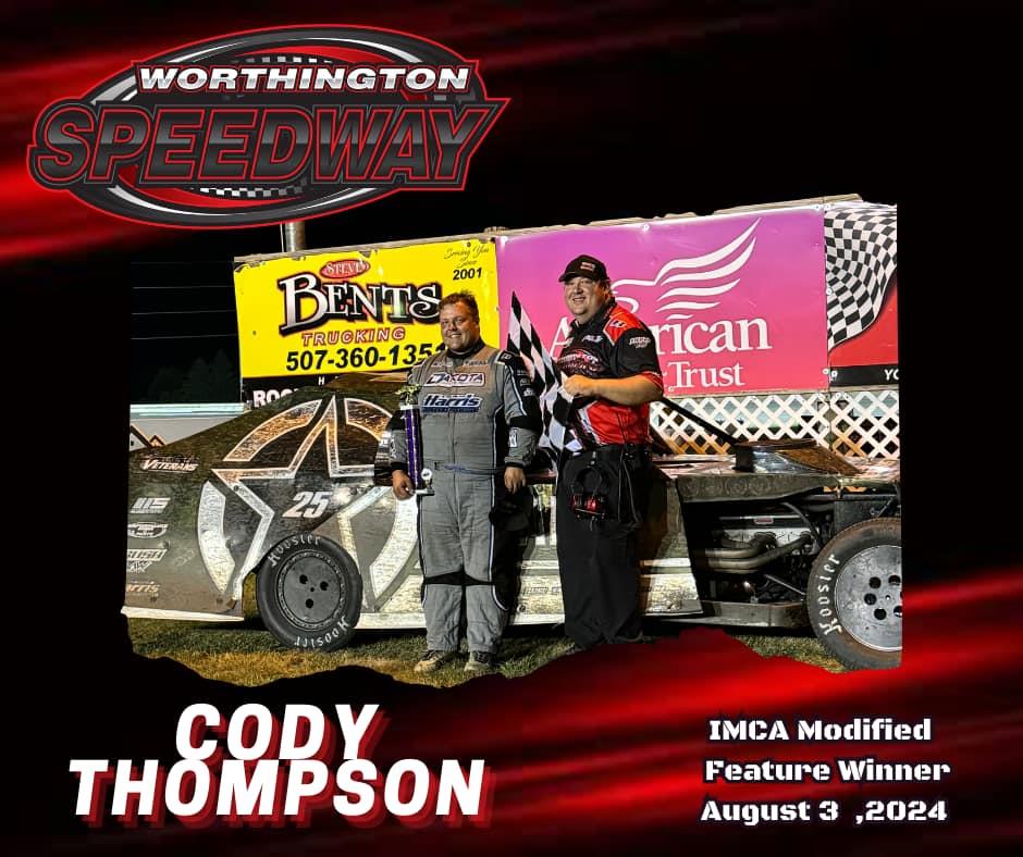 On Saturday, Cody Thompson claimed his second feature triumph of the year when he claimed victory in the IMCA Modified class at Worthington (Minnesota) Speedway.