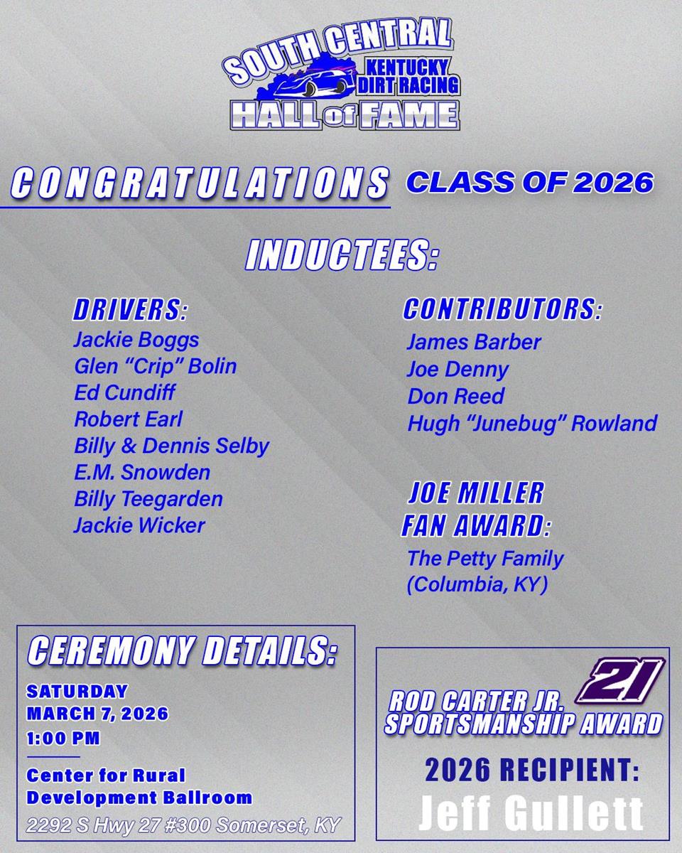 SOMERSET, KENTUCKY (August 29, 2025)—Voting Members have selected the seventh class of the South-Central Kentucky Dirt Racing Hall of Fame for 2026 featuring eight drivers, four contributors, the “Joe Miller Fan Vote” and the “Rod Carter Jr. Sportsmanship Award”.