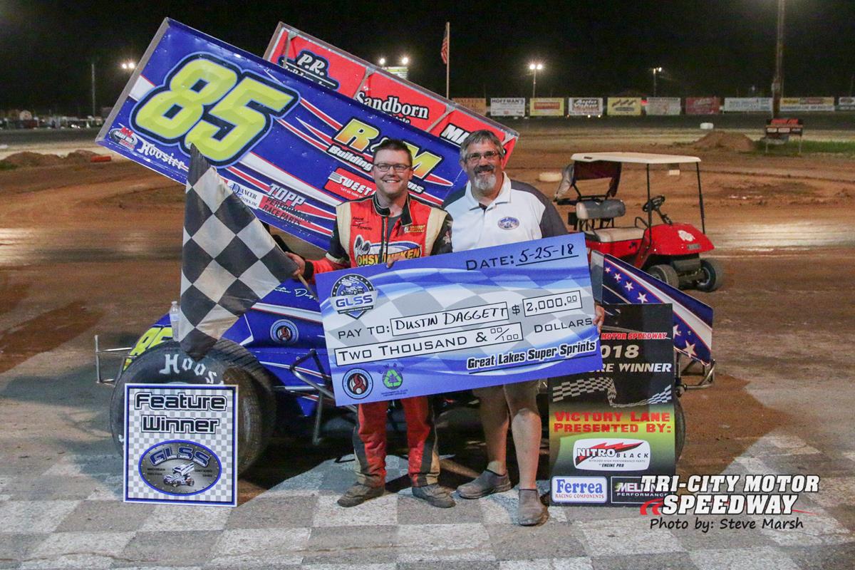 It took 16 laps of the 25-lap main event for the Great Lakes Super Sprints, but Grand Ledge’s #85 Dustin Daggett was able to come from a ninth-place starting spot to take the victory, keeping him undefeated early in the 2018 campaign after just the second race of the season. #19 Brett Mann brought the field to the green flag in the main event, leading the first several laps of the race until a caution for a spin by #6 Tyler Bearden. On the restart, #11R Chase Ridenour and Daggett were able to get around Mann. Ridenour would hold onto the lead until Daggett took over 16 laps in. With just four laps to go, #49T Gregg Dalman was able to get by Ridenour, moving into second where he would hang on, not able to catch Daggett. Ridenour would hang on for third place, followed by #77 Andrew Scheid in fourth and Mann in fifth. Schied was also the Engler Machine and Tool Hard Charger for the night, moving up 15 positions from his 19th-place start.
