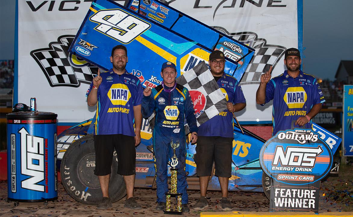 With little tread left to spare, the reigning World of Outlaws NOS Energy Drink Sprint Car Series champion’s tires propelled him to his third consecutive win at Cedar Lake Speedway Saturday night – sweeping the two $20,000-to-win Independence Day Spectacular Features.