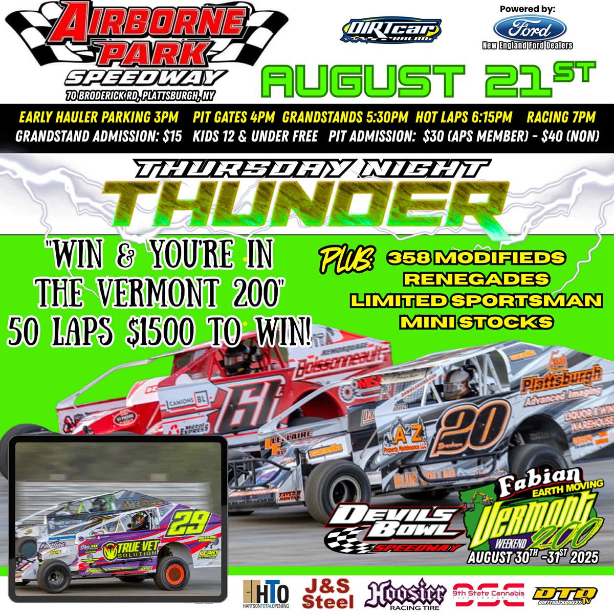"Win & You're in The Vermont 200" 50 Laps $1500 to win! Guaranteed Starting Spot in $10,000 to win Vermont 200 for Sportsman Winner + 358 Mods, Limited Sportsman, Renegades & Mini Stocks!