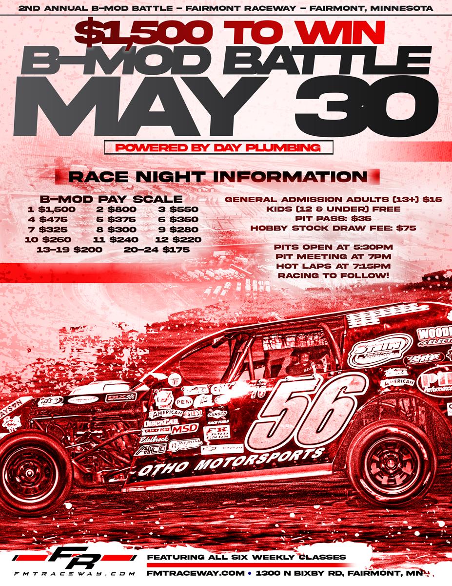 The second Annual USRA B-mod Battle, presented by Day Plumbing will take place Friday May 30th at the Fairmont Raceway.