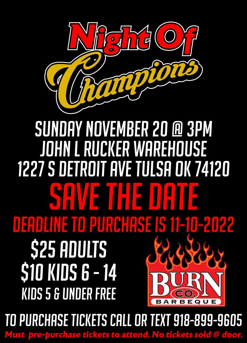 The Night of Champions Banquet is set for Sunday November 20, 2022 at 3 pm. The John L Rucker Warehouse located at 1227 S Detroit Ave in Tulsa Oklahoma will once again host the event. Burn Co BBQ is what is on the menu in 2022. Champions will eat free, Adult tickets are $25, Kids 6-14 $10 5 & Under Free. To purchase tickets please text or call 918-899-9605.