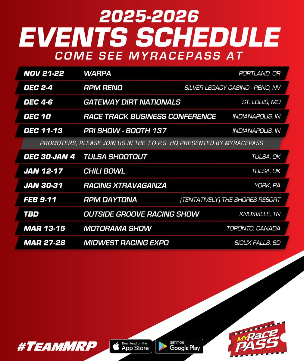 If you would like to find a time to meet with a MyRacePass representative at any of the shows listed, please contact us at Support@MyRacePass.com